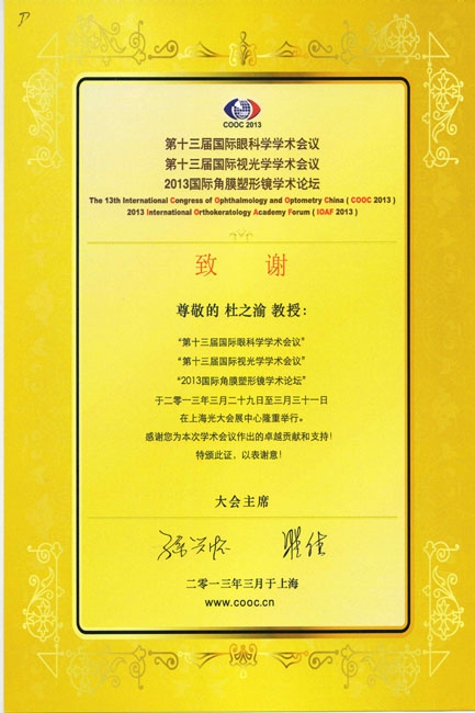 杜之渝(前排左二)與王錚(前排右二)等教授及衛(wèi)生部領(lǐng)導、工作人員在準分子標準啟動會上 杜之渝教授(右六)與美國“鷹眼計劃負責人”Steven Schallhorn博士(右五)在美國2010年ASCRS國際眼科會議上的合影 杜之渝教授與美國“鷹眼計劃負責人”Steven Schallhorn博士2009年在臺灣合影留念 杜之渝教授與Steven Schallhorn博士在澳大利亞第 23屆亞太眼科屈光及白內(nèi)障年會(APACRS)上的合影 杜之渝教與美國“鷹眼計劃負責人”Steven Schallhorn博士及美國同道2012年在ASCRS會上交流 杜之渝教授與美國“鷹眼計劃負責人”Steven Schallhorn博士2013年在歐洲眼屈光年會上合影留念