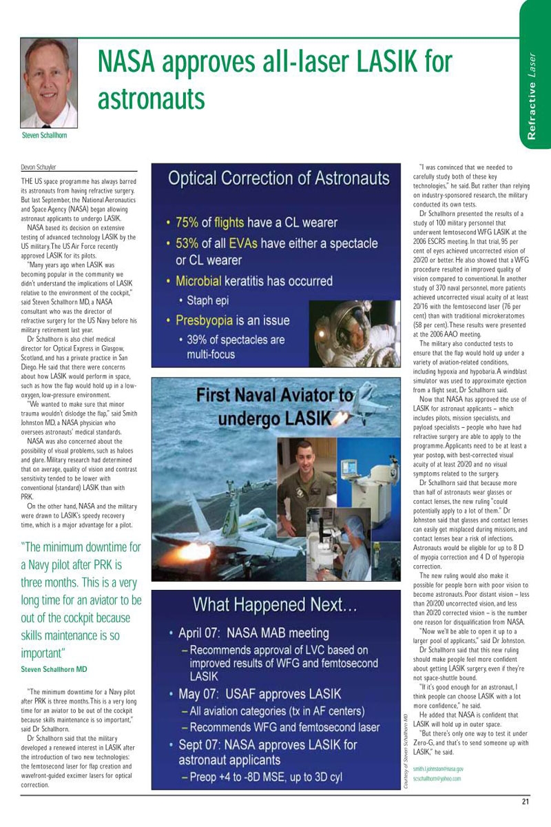 據(jù)眼科雜志《歐洲時代》報道,美國國家航空航天局(NASA)基于廣泛的軍方臨床數(shù)據(jù),核準全激光LASIK手術(shù),即iLASIK手術(shù)可用于在太空飛行的宇航員,以及執(zhí)行軍事任務(wù)的空軍飛行員。被譽為美國Steven Schallhorn博士是NASA及軍方鷹眼計劃主持人,在接受眼科權(quán)威雜志《歐洲時代》記者Devon Schuyler訪問時說:“NASA的決定是基于普遍的軍方臨床數(shù)據(jù)而來,AMO Advanced CustomVue(波前像差技術(shù))和Intralase®(飛秒激光技術(shù))的結(jié)合保證了LASIK手術(shù)極高的安全性和有效性。” Steven Schallhorn博士還談到,“經(jīng)過有效臨床數(shù)據(jù)的施行與報告,iLASIK手術(shù)——全激光準分子手術(shù)在安全性和有效性、視力質(zhì)量調(diào)整及夜間駕駛效能的視力改善技術(shù)上已純熟,手術(shù)過后的視力穩(wěn)定度在無重力、低氧濃度、干燥的太空環(huán)境中經(jīng)測試也未受影響,未來評選航天員資格時視力將不再是問題。NASA的批準進一步驗證了目前iLASIK手術(shù)超越了現(xiàn)有近視治療手術(shù)的安全性和有效性標準”。
