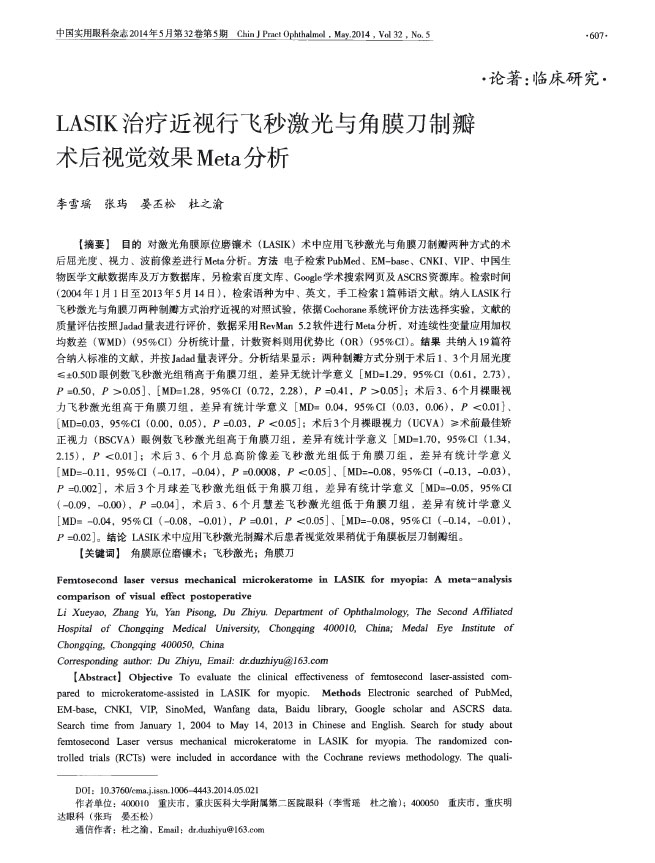LASIK治療近視行飛秒激光與角膜刀制瓣術(shù)后視覺效果Meta分析
