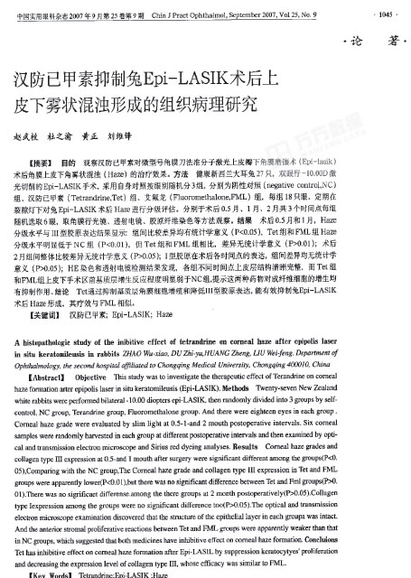 - 漢防己甲素抑制兔Epi-LASIK術(shù)后上皮下霧狀混濁形成的組織病理學(xué)研究