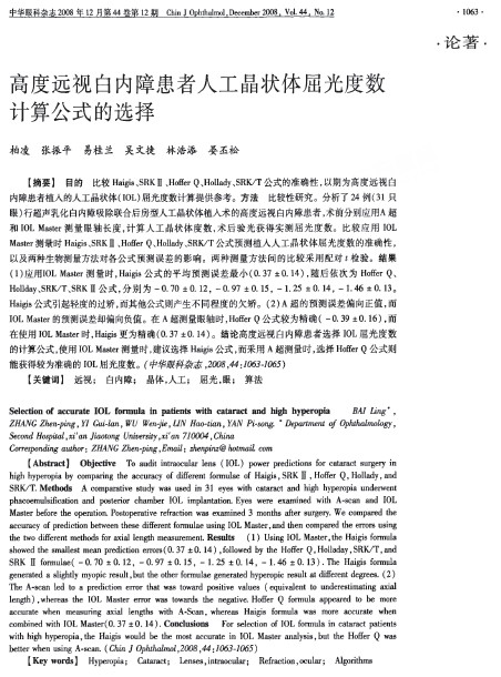 - 高度遠視白內(nèi)障患者人工晶狀體屈光度數(shù)計算公式的選擇