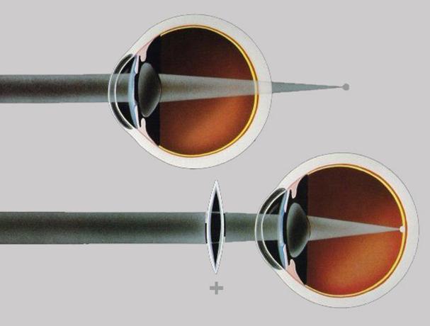 遠(yuǎn)視眼是由于眼軸較短,在不使用調(diào)節(jié)狀態(tài)時(shí),平行光線(xiàn)通過(guò)眼的屈折后主焦點(diǎn)落于視網(wǎng)膜之后。而在視網(wǎng)膜上不能形成清晰的圖像。為此,遠(yuǎn)視眼經(jīng)常需要運(yùn)用調(diào)節(jié)來(lái)加強(qiáng)眼的屈光力,使進(jìn)入眼球的光線(xiàn)能集合在視網(wǎng)膜上并成為清晰的物像。處在休息狀態(tài)的眼使平行光的視網(wǎng)膜的后面形成焦點(diǎn),稱(chēng)為遠(yuǎn)視眼(hypermetropia,hyperopia)。這種眼的光學(xué)焦點(diǎn)在視網(wǎng)膜之后,因而在視網(wǎng)膜上所形成的像是模糊不清的。為了看清遠(yuǎn)處物體,要利用調(diào)節(jié)力量把視網(wǎng)膜后面的焦點(diǎn)移到視網(wǎng)膜上,故遠(yuǎn)視眼經(jīng)常處在調(diào)節(jié)狀態(tài),易發(fā)生眼疲勞。